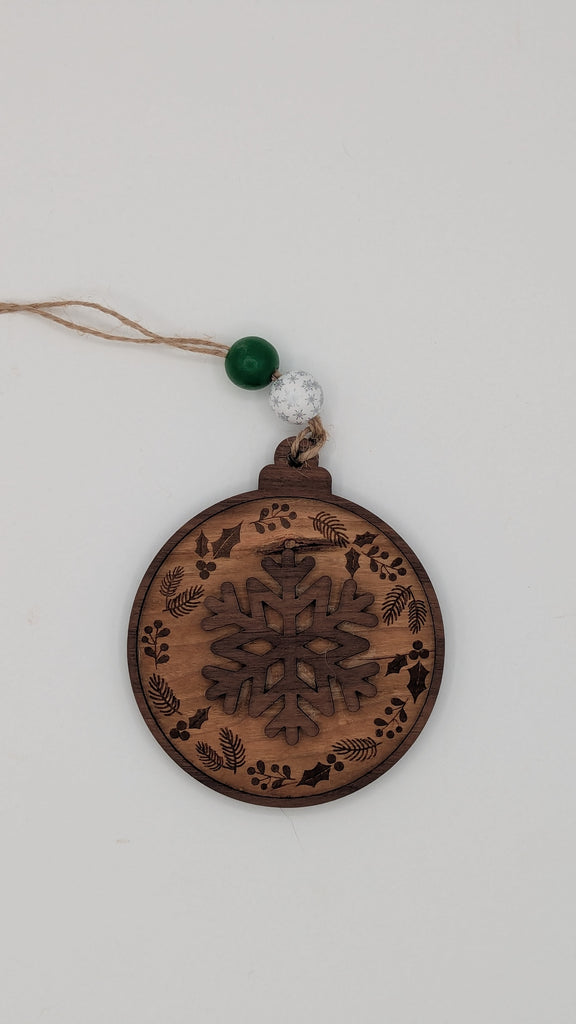 This ornament features a layered snowflake at the centre, surrounded by delicately engraved holly, berries, and pine branches. The combination of laser-engraved detail and a raised snowflake gives it a beautiful 3D effect without adding weight.