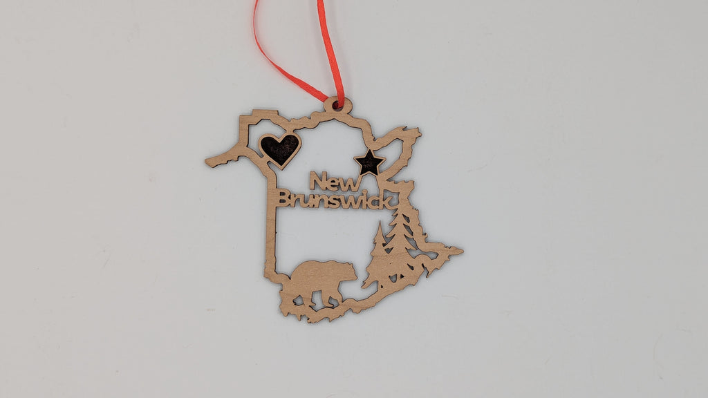 Celebrate the beauty of New Brunswick with this detailed wooden ornament, laser-cut in the shape of the province and accented with a black bear and evergreen trees. Crafted from maple plywood, this lightweight ornament is perfect for gifting, collecting, or adding a touch of NB pride to your Christmas tree.