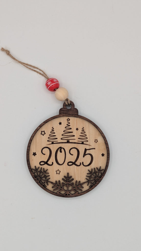 This ornament features three stylized Christmas trees engraved above a bold 2025, with layered snowflakes along the bottom for added depth and detail. Festive wooden beads and natural jute twine complete the look.